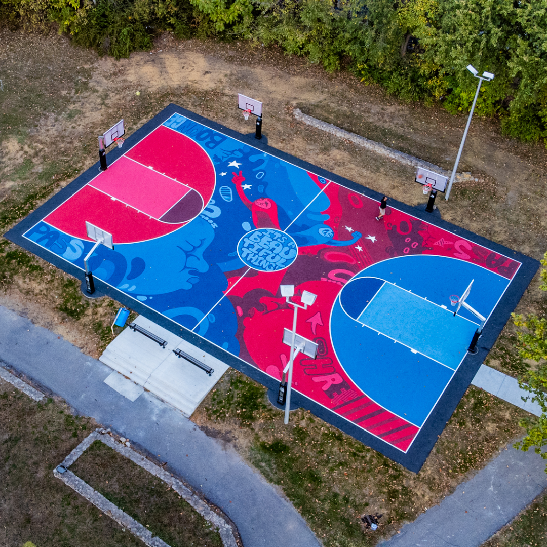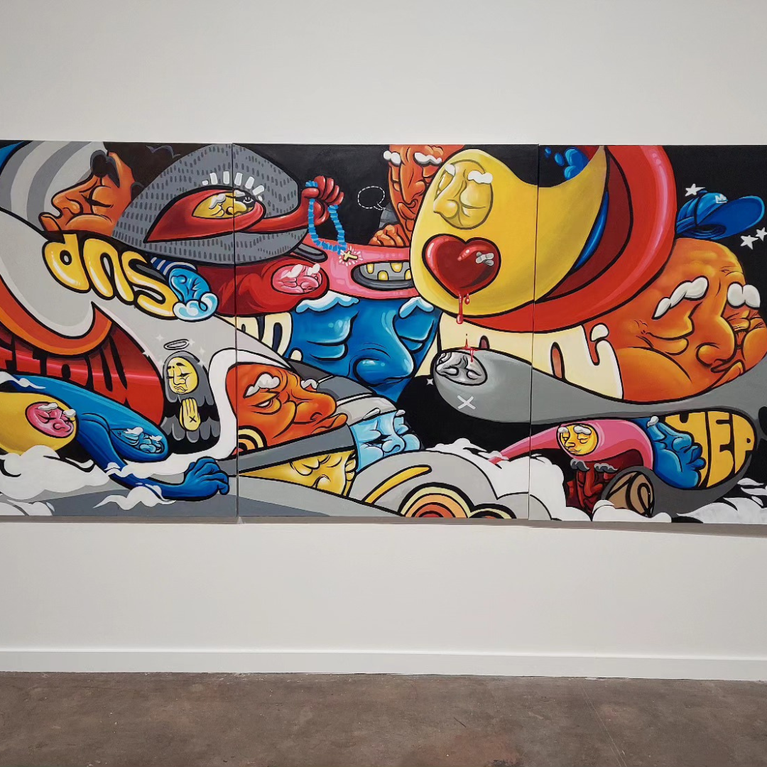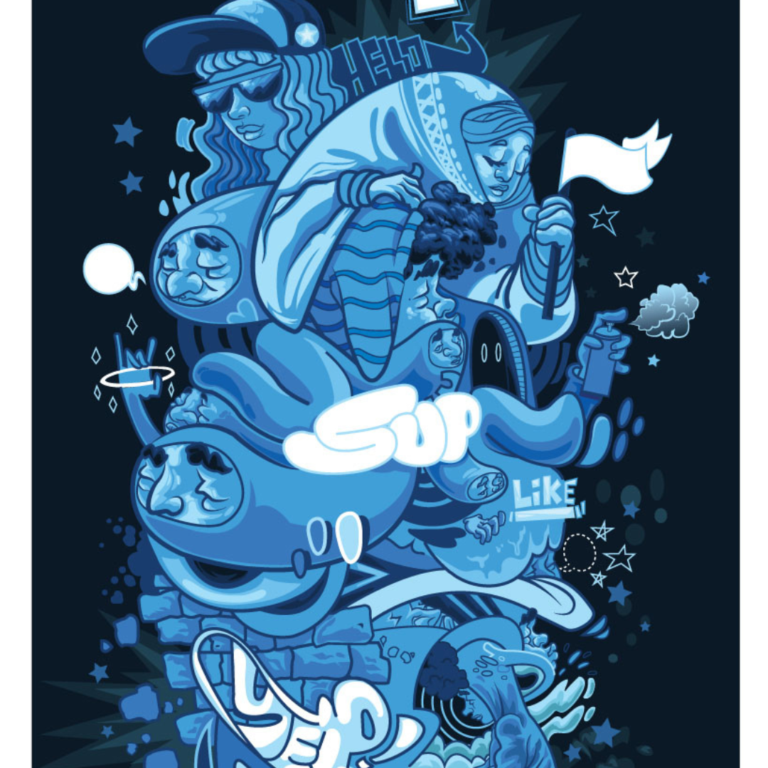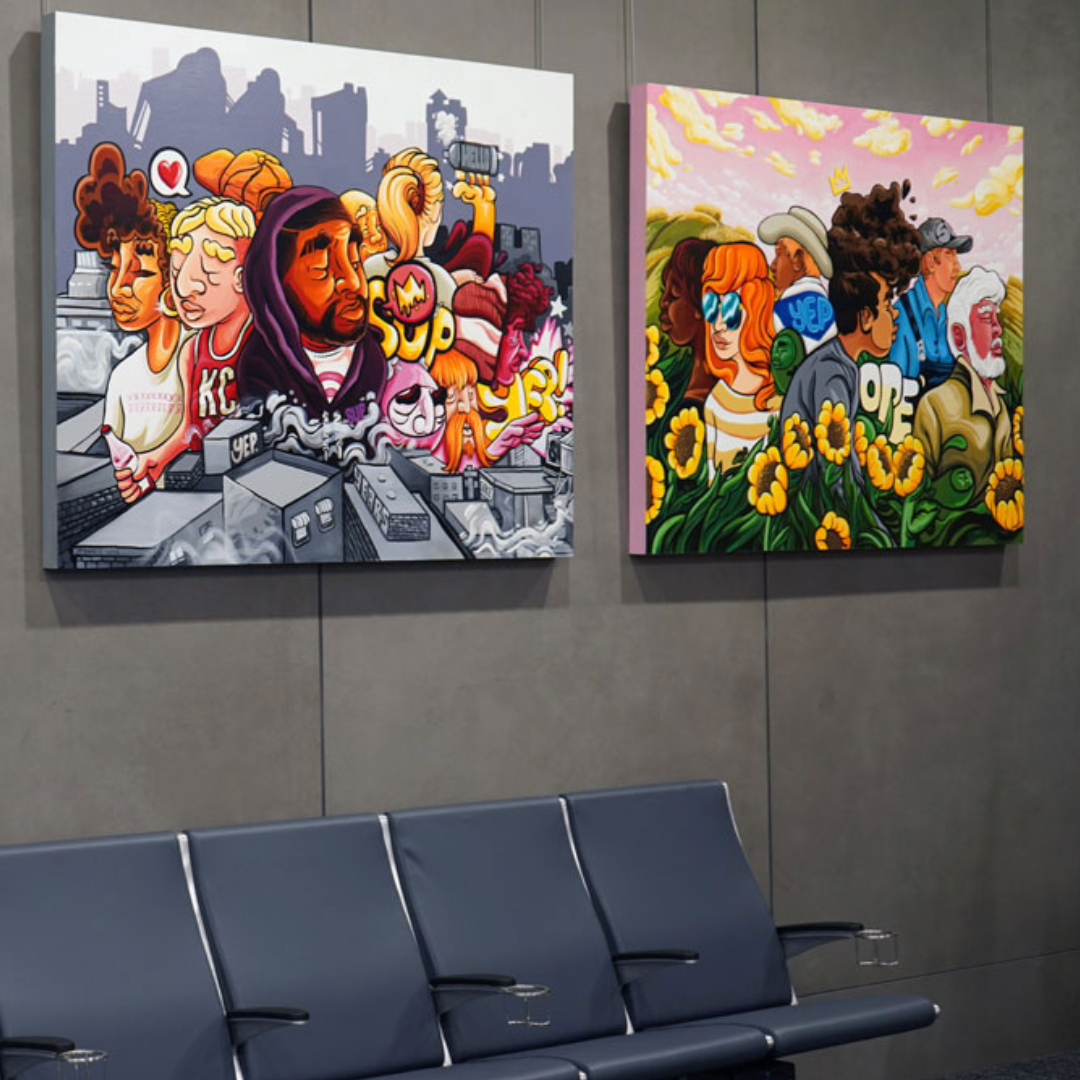 JT Daniels (b. 1985, Kansas City, KS) is a visual artist and muralist whose work blends characters, phrases, and graphic elements into designs reflecting the heartbeat of urban life. His layered illustrations, featuring overlapping faces and figures, capture the conversations and interactions that shape the ever-changing human experience. Daniels has exhibited at the Lawrence Arts Center, The Nelson-Atkins Museum of Art, and more. His work is in collections including Kansas City International Airport and Park University. He has created drink label designs with Brisk Iced Tea, Duvel and Torn Label Brewery. Daniels lives and works in Kansas City, MO.